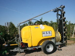The HSS CF1500 is a trailer orchard sprayer equipped with a spray mast with eight continuously adjustable air outlets distributed over a height of 300 cm, suitable for a maximum tree height of 340 cm. The air outlets that are adjustable in both height and angle making it possible to create the perfect spraying pattern for every type of orchard, offering the greatest possible leaf cover.